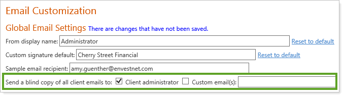For compliance and auditing reasons, many of you have asked for the ability to receive copies of all emails generated from Advisor View to your clients. With this release, we have updated the Email settings so that you can now send a blind copy of client emails to either the client administrator or a recipient that you determine. To access this option, click Email from the Setup menu.