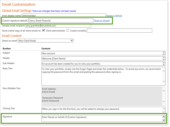 When you create your signature on the Email Customization page, you will need to add a Custom Signature merge field in addition to the User Name merge field (previously called the Advisor Name merge field). You can set the default custom signature on the same page in the Global Email Settings section.