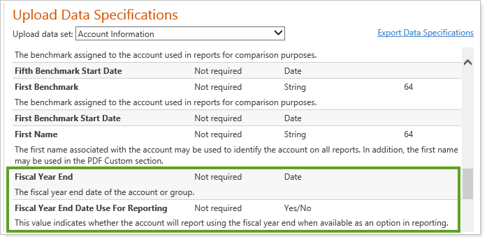You can also upload the data for fiscal year by entering a date in the Fiscal Year End column of your data set, and typing yes in the Year End Date Use For Reporting column.