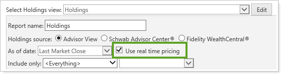 The setting is set at the account level, so you can choose which accounts use the custodian file and which use the data that's in Advisor View. If you maintain your accounts and groups in Advisor View, you can enable the option by selecting the new check box on the Reporting page of the Edit Accounts dialog.