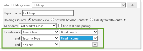 You can now filter by multiple levels on the dynamic Holdings report and in the Holdings section of the PDF Template. For instance, instead of seeing all of your Asset Class holdings, you can now narrow what's included to just the Asset Class holdings for Fixed Income, and you can add additional filtering beyond that, as needed.
