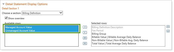 We added the option to track managed and unmanaged account values on your billing statements. You will see two new columns for the billing definition level and the individual account level: