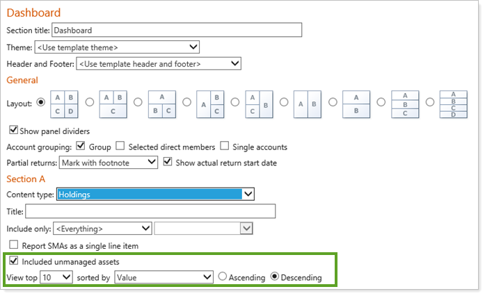 You can choose whether to include unmanaged assets in the Dashboard section for PDF Templates. By default, the Include unmanaged assets check box is selected for the Holdings content type in the Dashboard section.
