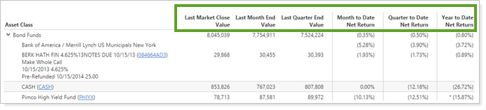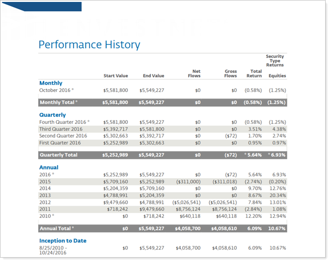 We know how valuable it is to track the performance of your accounts over time, so we have built a new PDF report called Performance History. You'll now be able to compare performance for an account or group with multiple date periods and categories (such as asset classes). For example, you can look in the Net Investment Gain column to see what that value was for each month. Or you could compare the end value for each quarter in order to identify performance patterns.