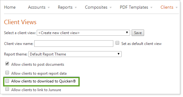 We can enable this option at your request, and once it's enabled, you can select the Allow clients to download to Quicken check box on the Client Views page so any clients using that view will be able to export to supported Quicken products.