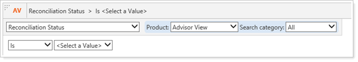 Reconciliation Status.Allows you to search by whether an account is or is not currently reconciled, unreconciled, force published, manual, or missing.