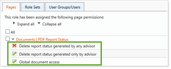 We have given you more control over what advisors can access by adding a new delete permission for the PDF Report Status page. Previously, advisors were allowed to delete any report status. We have renamed this permission and it is now named Delete report status generated by any advisor. In addition, we have created a permission that limits advisors' delete permissions to only the report statuses they have created themselves. This new permission is named Delete report status generated only by advisor.