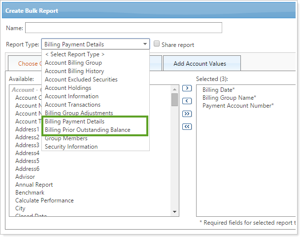 You can also see outstanding balances on the Account Billing History bulk report if you add the Current Prior Outstanding Balance column, and we've added two new bulk reports on the Create Bulk Report page that help you view and track payment information: