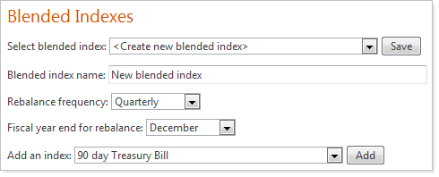 In the Select blended index list, choose the blended index where you want to change the rebalance frequency. If you haven't created a blended index, click Create new blended index.