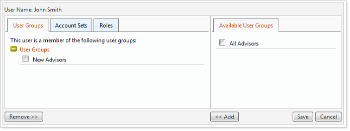 To add a user group, account set, or role, in the available list, select the associated check box and then click Add.