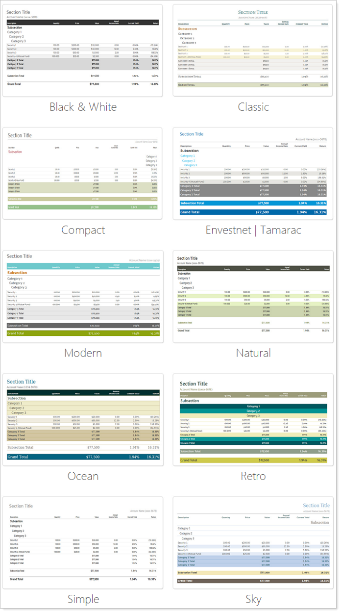 While Tamarac Reporting does an excellent job of helping you personalize your reports, we felt our PDF reports would benefit from a more professional look. That's why we're excited to announce that you can now apply custom themes to your Tamarac Reporting reports.