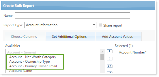 To update these fields for existing financial accounts by upload, create an Account Information bulk report and add the following new columns: