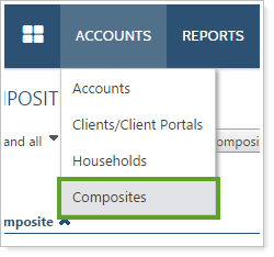 In the Accounts menu, you find items that relate to managing entities such as groups and Households. Because composites also allow you to manage entities—in this case, portfolios that represent a particular investment strategy—you will now find the Composites page under the Accounts menu for consistency.