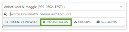 Recently Viewed: When you click in the search field but don't enter any search terms, you see a list of the top 250 most recently viewed records, including all accounts, groups, and account sets or Households, sorted most recent to least recent. Top Results: When you type in search terms, you see a list of results matching your search, sorted by type. Each section will display the top 15 search results, with additional results displayed under each tab. |