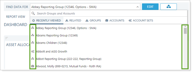 No Search: You see a list of the most recently viewed groups, accounts, or account sets, depending on which tab you're looking at. After displaying all recently viewed records, the list shows all the other records of that type in alphabetical order. Search: You see a list of results matching your search sorted by type. The results under each tab include only that type of record. |