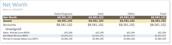 The Households tab works the same as the other tabs. It appears only on the Net Worth dynamic report page, and the Account Sets tab is removed.