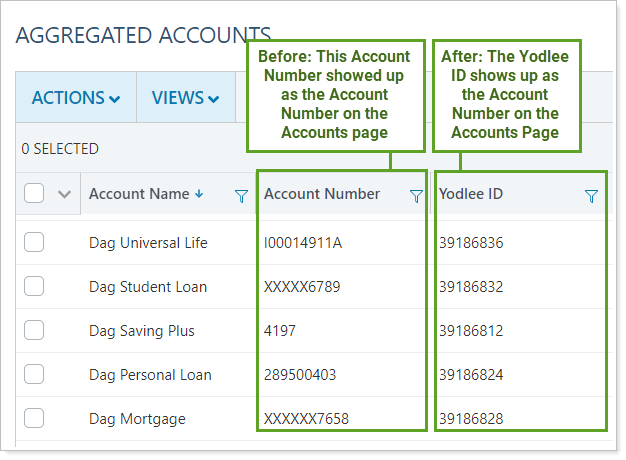 We’ve heard your feedback about how account numbers for Yodlee integrated reconciled accounts do not always work smoothly with rebalancing features. In response to your feedback, we replaced the previous account numbers with the account's Yodlee ID numbers for new and existing reconciled accounts.