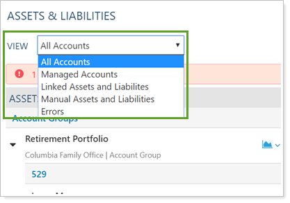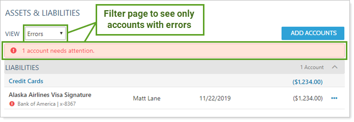 Clients can use either option to filter the Assets & Liabilities page to display only linked accounts with errors that the client can resolve.