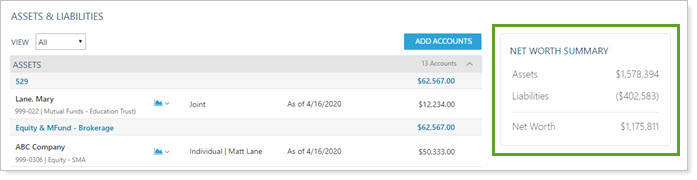 If the Assets & Liabilities page brings together disparate elements of a client's finances into one picture, the new Net Worth Summary section provides a quick, at-a-glance overview of that picture.