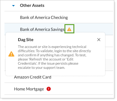 Linked error alerts and resolution functionality works the same as it does on the Assets & Liabilities client portal page.