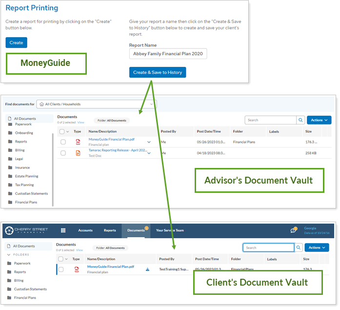 If your firm uses the MoneyGuide integration, when you click Create & Save to History in MoneyGuide, copies of the MoneyGuide financial plan report automatically save to the Tamarac document vault. You and your clients see those PDF reports saved in the Financial Plans folder.