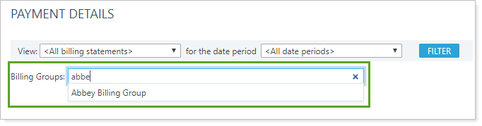 To search for a billing group, begin typing and click the name of the billing group when it appears. You must type at least two letters to see any groups listed.