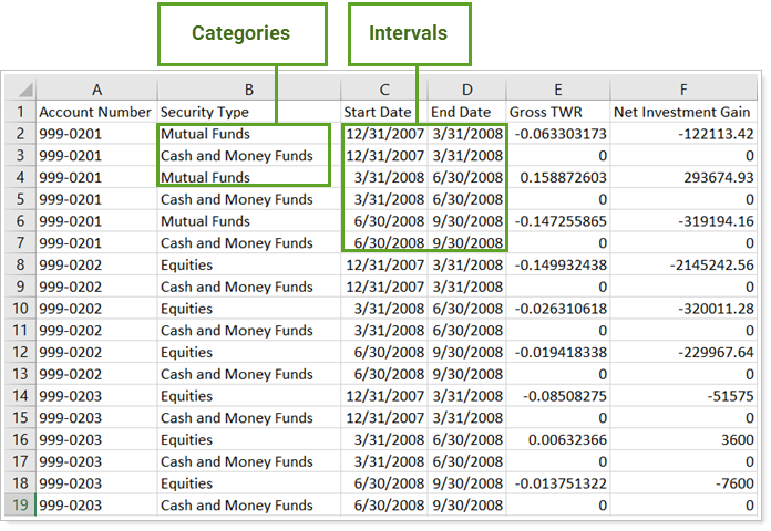 Evaluate returns by category, interval, or both. Filter all the accounts in the bulk report by category type; check returns over monthly, quarterly, or annual intervals; or combine both to evaluate category returns over the desired interval. Answer questions like "What accounts had the highest returns for equities each quarter over the last 5 years?" and "What categories performed worst per month over the last year?"