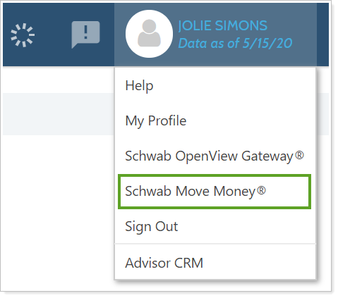 You'll now access Schwab Move Money in the profile menu, just as you would for many other custodial integrations available within Tamarac.