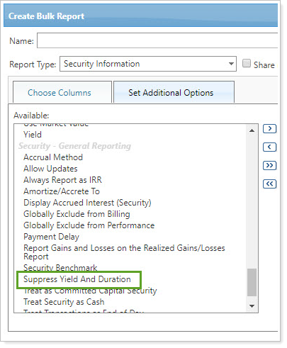 For an Individual Security. To suppress yield and duration for an individual security, on that security's Reporting Settings panel, select Suppress yield and duration. Yield will be suppressed for that individual security only.