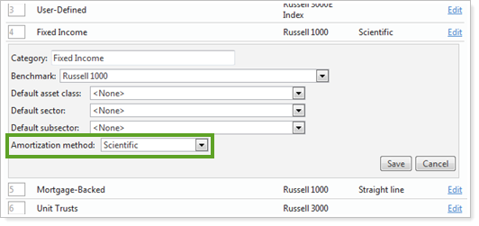 Advisor View offers the following amortization methods for the report: Scientific and Straight Line. The Scientific method produces adjustments that gradually increase each period while the Straight Line method produces adjustments that are evenly distributed across all periods.