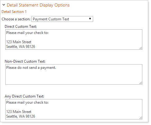Now you can add custom text for both direct and non-direct payment types. Before this release, you could only include custom text for a direct payment. To do this, we've added a Payment Custom Text option to the Detail Statement Display Options.