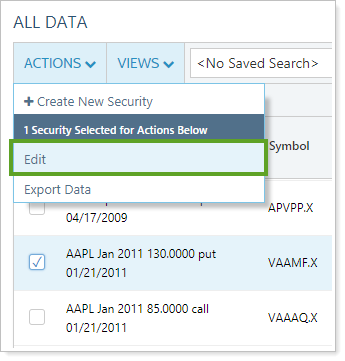 Select the check box next to the security where you want to complete the custom field and then click Edit in the More Actions list. You can use the Search securities box to search for any security.