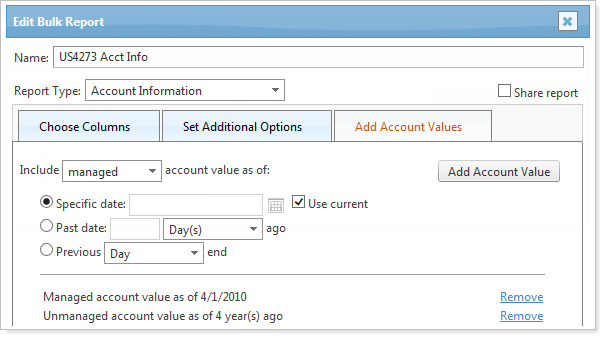 Advisors prefer to report on managed and unmanaged assets in a number of different ways. Some advisors prefer to concentrate only on managed assets, while others prefer to see both or the total amount. When you create the Account Information bulk report, you now determine the inclusion of managed and unmanaged asset values.