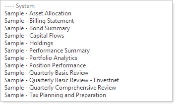 We've added new system templates and updated the existing ones to include the latest features we've added to Advisor View. These new templates have updated graphics, cover pages, and show off some potential best practices for the most commonly used PDF sections. You can find the new and updated system templates in the Select a Template list under ---- System.