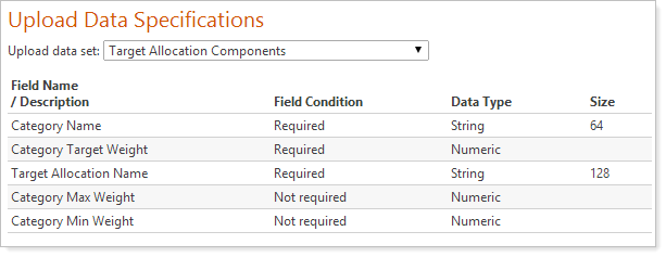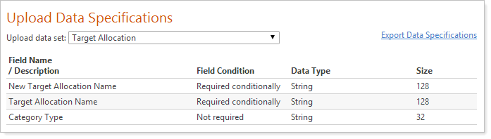 You can now bulk upload target allocations, which compare account holdings to account targets. Uploading target allocations requires using the following upload data sets: