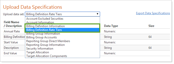 Billing Rate Tiers.Use this upload data set to create the rate tiers for your billing definitions.