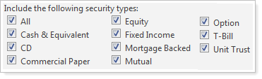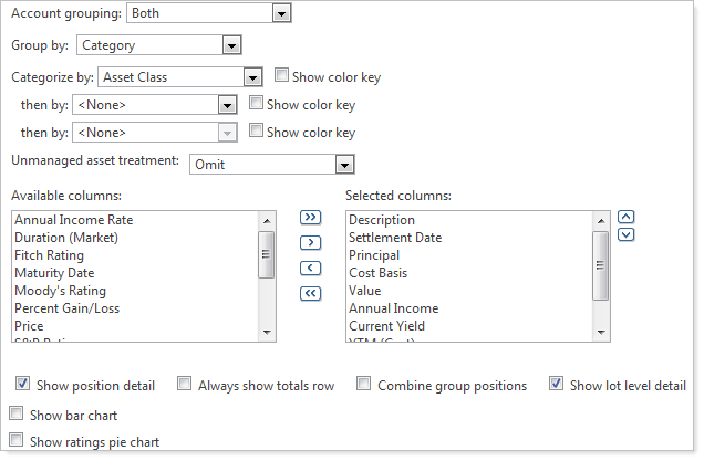 Categorize by If you choose Category in the Group by list, choose the category you want to group the data on the report by. You can choose from security type, asset class, sector, and subsector.