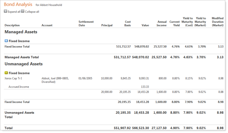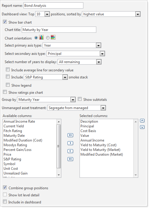 Many of you have asked for fixed income reports for bond analysis. With this release, we've released the Bond Analysis report. This report includes the option to list all fixed income securities with the yield to maturity and modified duration, at cost and at market value.