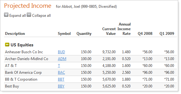 • To view the projected income for a security in aggregate for the group, select the Combine group positions check box.
