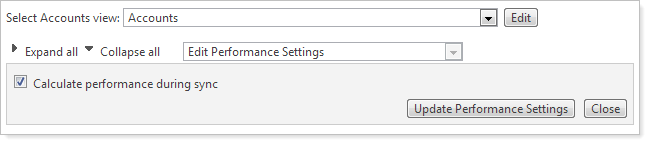 You now have complete control over the accounts and groups for which Advisor View will calculate performance during the sync. If you don't want Advisor View to calculate performance for a particular account or group during the sync, on the Accounts page, select the applicable accounts or groups, and click Edit Performance Settings in the More Actions list.