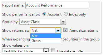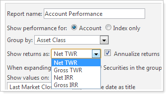 You now have the option to display the internal rate of return on the dynamic Account Performance report. Before this release, time-weighted return was the only option.