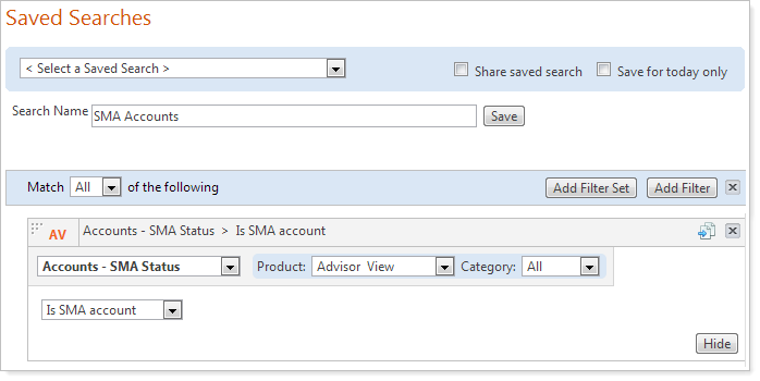 Using saved searches, you can look for accounts that meet specific criteria - for example, you can use a saved search to locate accounts that are holding between $1 and $10,000 of IBM. By using saved searches, you can organize daily workflows to monitor accounts that meet your predefined criteria - across your Tamarac products.