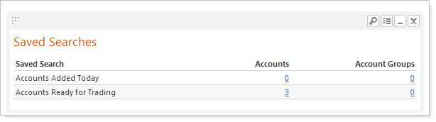 For example, let's say that each day you want to search for all accounts that have drifted outside of a specified tolerance range. You can build the saved search once and save it. Whenever you want to see the latest accounts that have drifted out of tolerance, you can simply choose the saved search on the Accounts page.