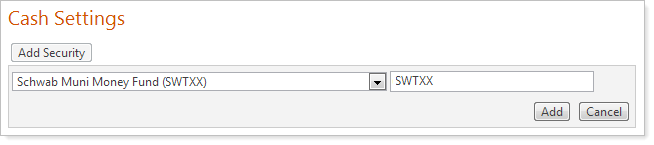 In the Search Securities box, start typing the symbol that you want to designate as cash. When you see it in the list, click Add.