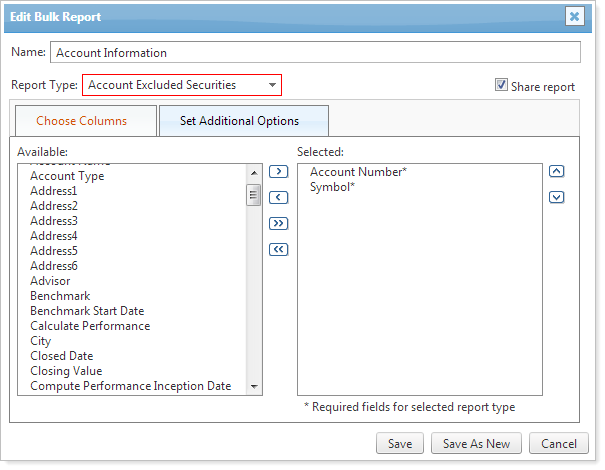 We're pleased to introduce the Account Excluded Securities bulk report. This report shows accounts with at least one security that is excluded from either performance or billing. This report is available to all users of Advisor View – regardless of whether or not you maintain accounts and securities in Advisor View.