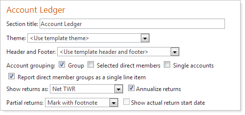 By default, this report shows the account name, account number, start date, net contributions amount, net investment gain, interest and dividends, and end value.