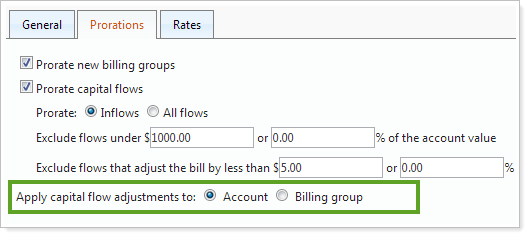 apply capital flow adjustments to account vs. billing group.Today, capital flows adjustments are applied at the billing group level for billing purposes. Now, Advisor View gives you the option at the billing definition level to apply capital flow adjustments at the account level instead of the billing group level.