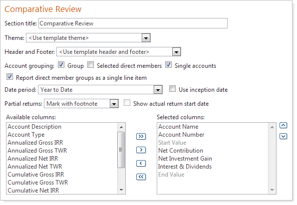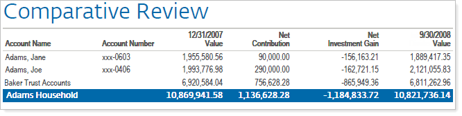 Over the years, we've heard feedback that you sometimes want to see consolidated totals for your accounts for a particular date range. We have also heard that you want to show both IRR and TWR as columns together on a single report. We've listened to your feedback and have added the Comparative Review PDF section.