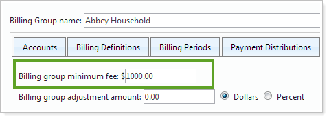 Set a minimum fee at the billing group level.Now you can set the minimum fee amount for a billing group. If the fee is less than this amount, Advisor View will automatically assign the fee listed in the Billing group minimum fee box. You can find this box on the Adjustments tab for the billing group.