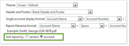 Over time, some of you have asked for the ability to order the PDF output by account first and then by section. If you use the same settings in the previous example, the output for the report would look like: